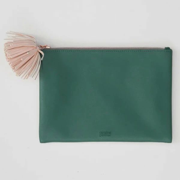 Make a style statement with this luxury leather-look clutch bag featuring a bold forest green body with a calming blush pink tassel. This zip top pouch can fit all your evening accessories and is a fun addition to your night time attire. Leather-look PU. Rose gold detailing. Blush pink pom tassel. Black and white heart print lining. Inner open pocket inside. Dimensions: H16.5 x W23 x D1.5 cm.