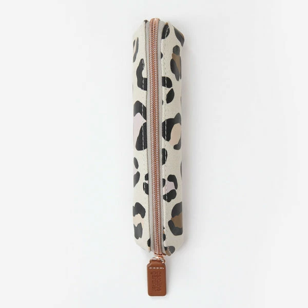 This chic pencil case is a beautifully tactile accessory that will bring a touch of luxe to your desk and is a practical size for on the go. This pencil case is made of canvas with a pink leopard print. The slim shape and rose gold zip fastening make this ideal for essential pens and stationery, but could equally store makeup brushes and mascara. Dimensions: H4 x W19.5 x D3.5 cm Composition: Printed canvas Black and white stripe lining Rose gold colour zip Leather-look pull Perfect for make up brushes