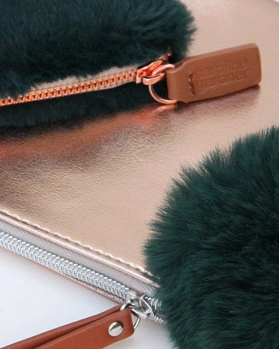 Metallic leather look pouch with green faux fur pom, complete with monochrome heart print lining. Dimensions: H160 x W230mm