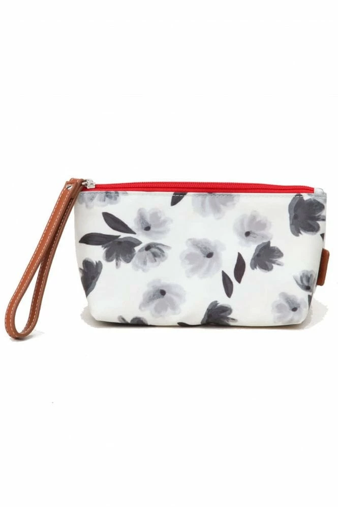 Caroline Gardner Rose Tinted Wristlet Cosmetic Bag Floral print Easy wipe clean fabric Printed coated cotton canvas Tanned leather look wristlet strap 1 Inner pocket Ample space for medium size toiletries Size: 10 x 22 x 10cm 31387
