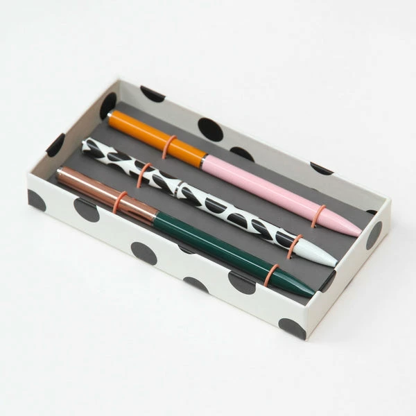 This pen set contains three 3 black ink ballpoint pens, in a stylish slimline style. With metallic, falling hearts and bold colours designs and gorgeously patterned matchbox-style box, it’s an ideal gift for every lux-loving note-taker. Dimensions: Box size H 14 x W 7 x D 2 cm Composition Aluminium Ball point pens (can be refilled with a standard Ballpoint refill) Black ink