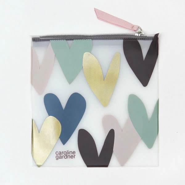 Our face mask pouch with our signature print of falling hearts, you can store face masks in style! Our frosted, wipe clean pouch features a black zip with contrasting pale pinkzip pull. This unique pouch can hygienically store two masks, so that you are never caught without one. Dimensions: H160 x W165mmMaterial: PVCMasks sold separately