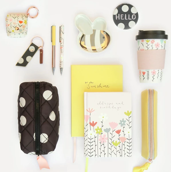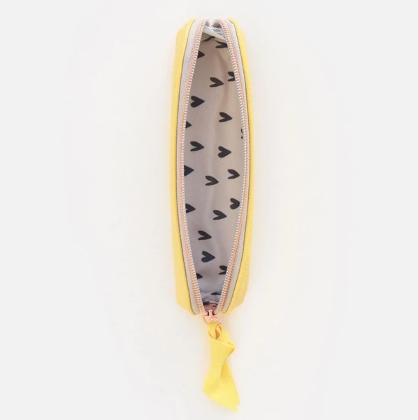 This chic pencil case is a beautifully tactile accessory that will bring a touch of luxe to your desk and is a practical size for on the go. This pencil case is made of a soft yellow PU vegan leather. The slim shape and rose gold zip fastening make this ideal for essential pens and stationery, but could equally store makeup brushes and mascara. Dimensions: H4 x W19.5 x D3.5 cm Composition: Yellow PU Vegan Leather Black and white scattered hearts lining Rose gold colour zip Grosgrain zip pull Perfect for make up brushes