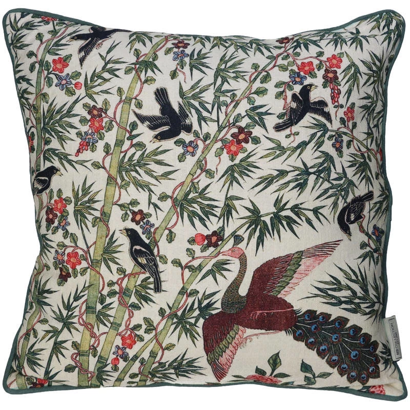 Een mooi en decoratief kussen met een kleurige print met vogels en is gemaakt van katoen