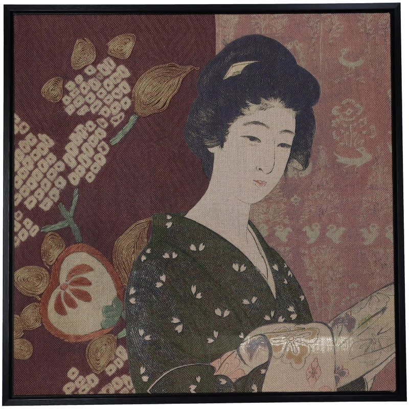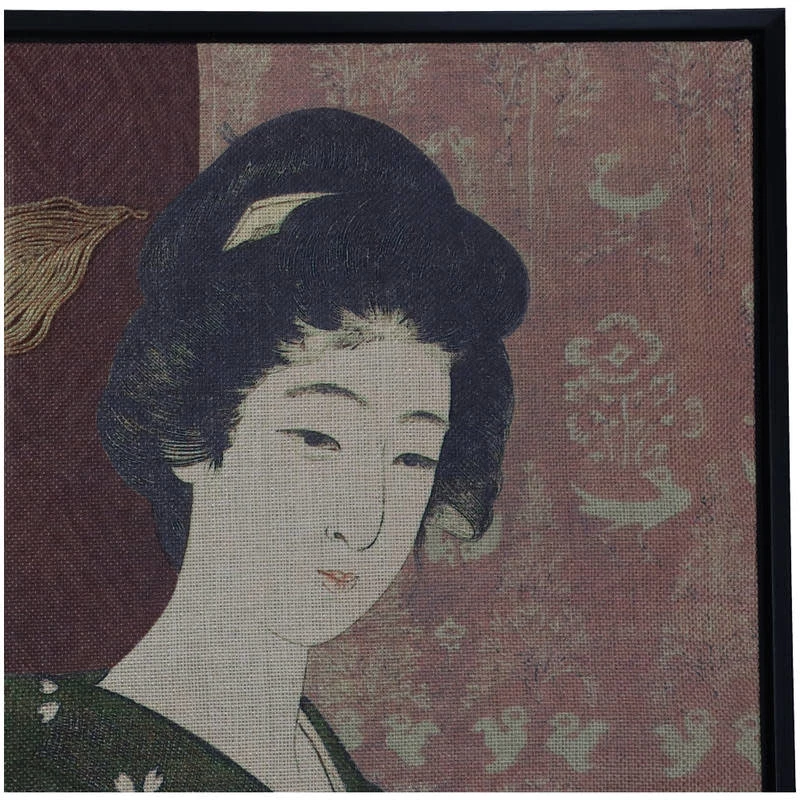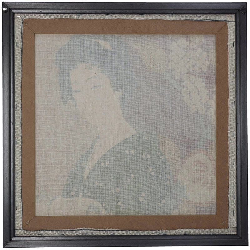 Dit paneel met een afbeelding van een Geisha is bespannen met linnen.