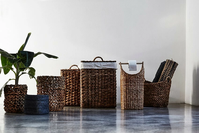 Hand-woven baskets from Muubs. Knitting is made of bark from banana palm, giving the baskets a unique expression. The knitted baskets are stiff in structure, and therefore they are ideal for storage as well as a pot for your plants. Tip: Turn the baskets on the head, and use them as a side table.