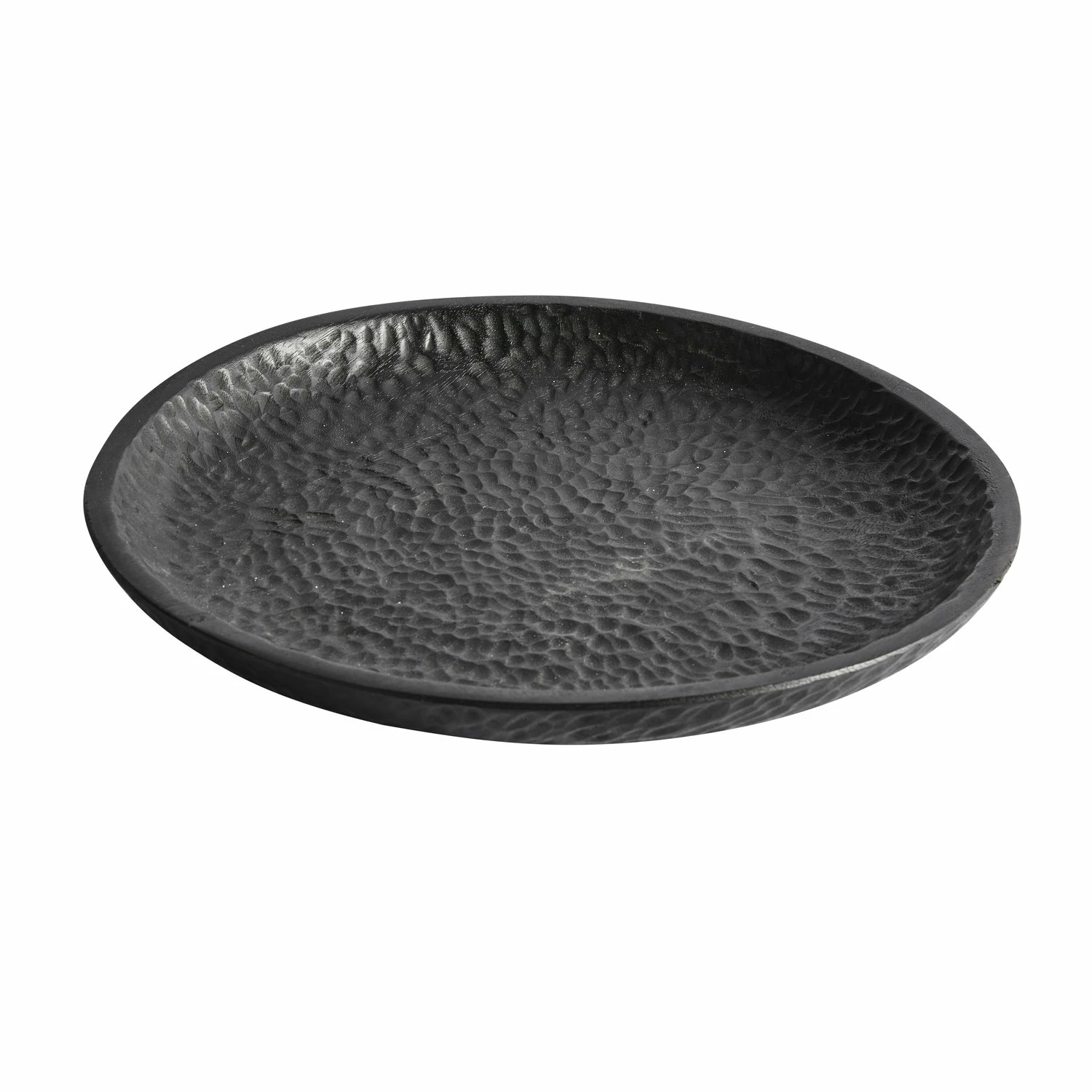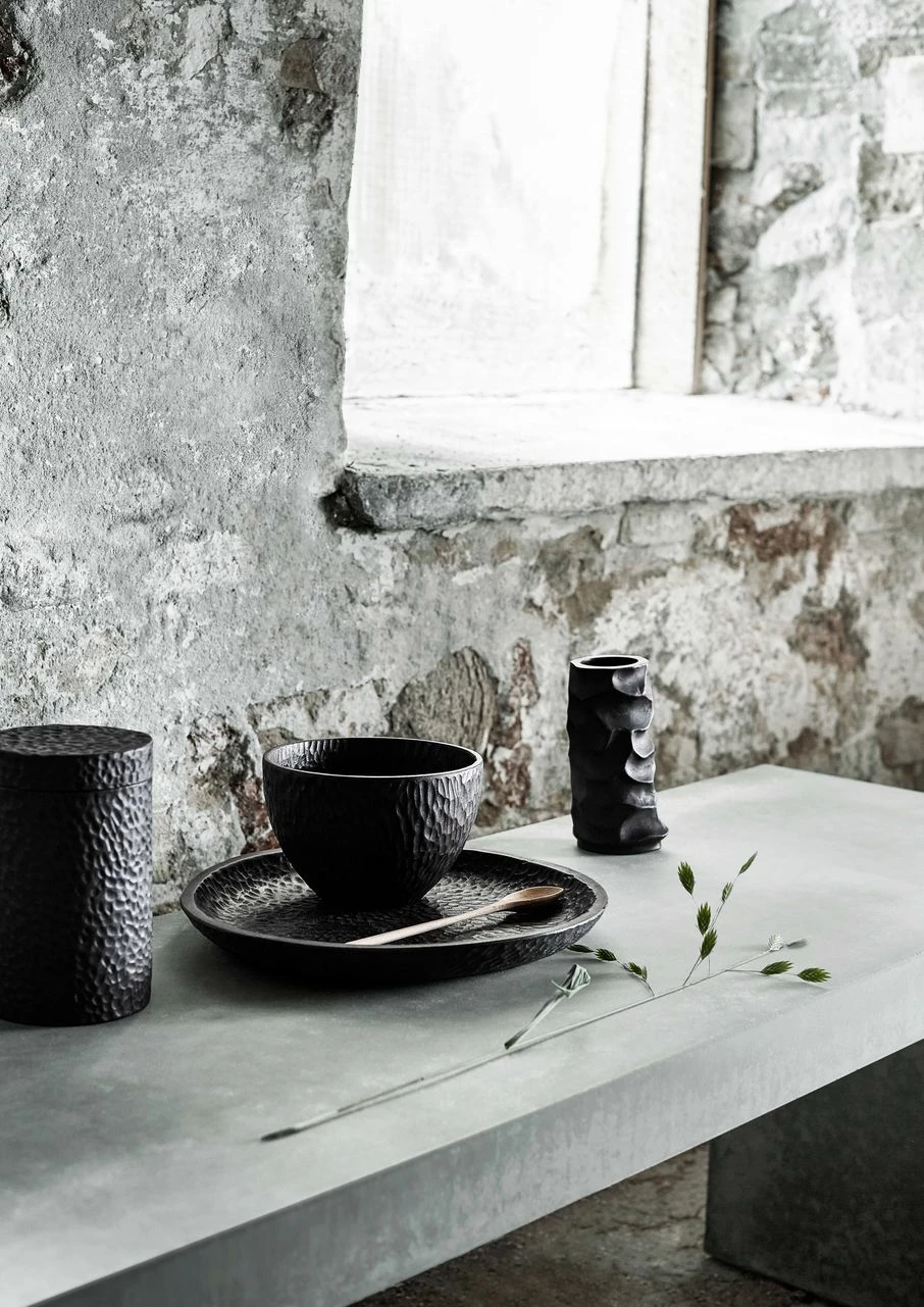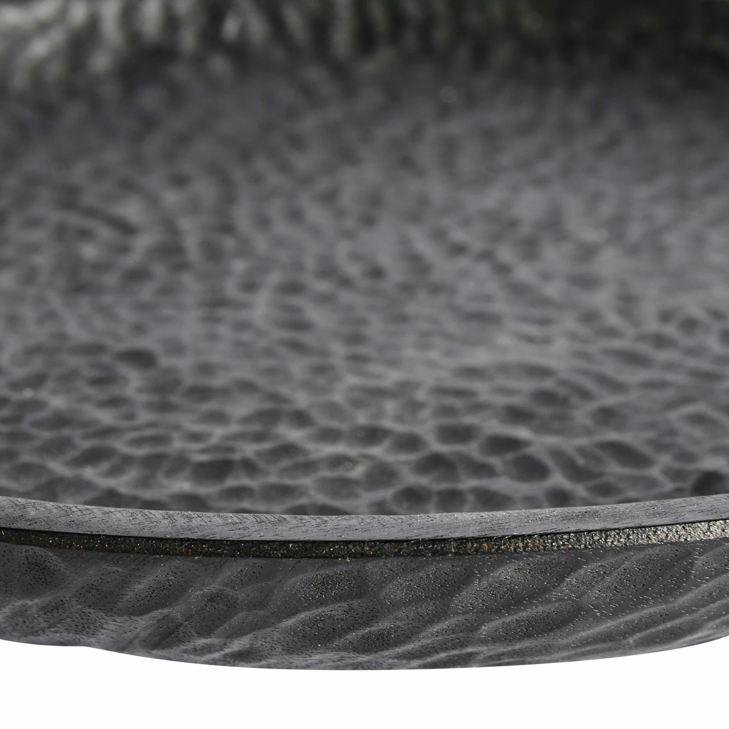 Hand-carved plate by Muubs. The plate is made from mahogany and hand-carved in order to give it the unique surface. When the plate has been carved into the desired shape and has got the characteristic surface, it is blackened with a gas flame, in order to reach the deep black nuance, through a traditional and natural method that has been practiced for decades. Combine the hand-carved plate in mahogany with the Muubs plates in teak to create a new expression on the dinner table.
