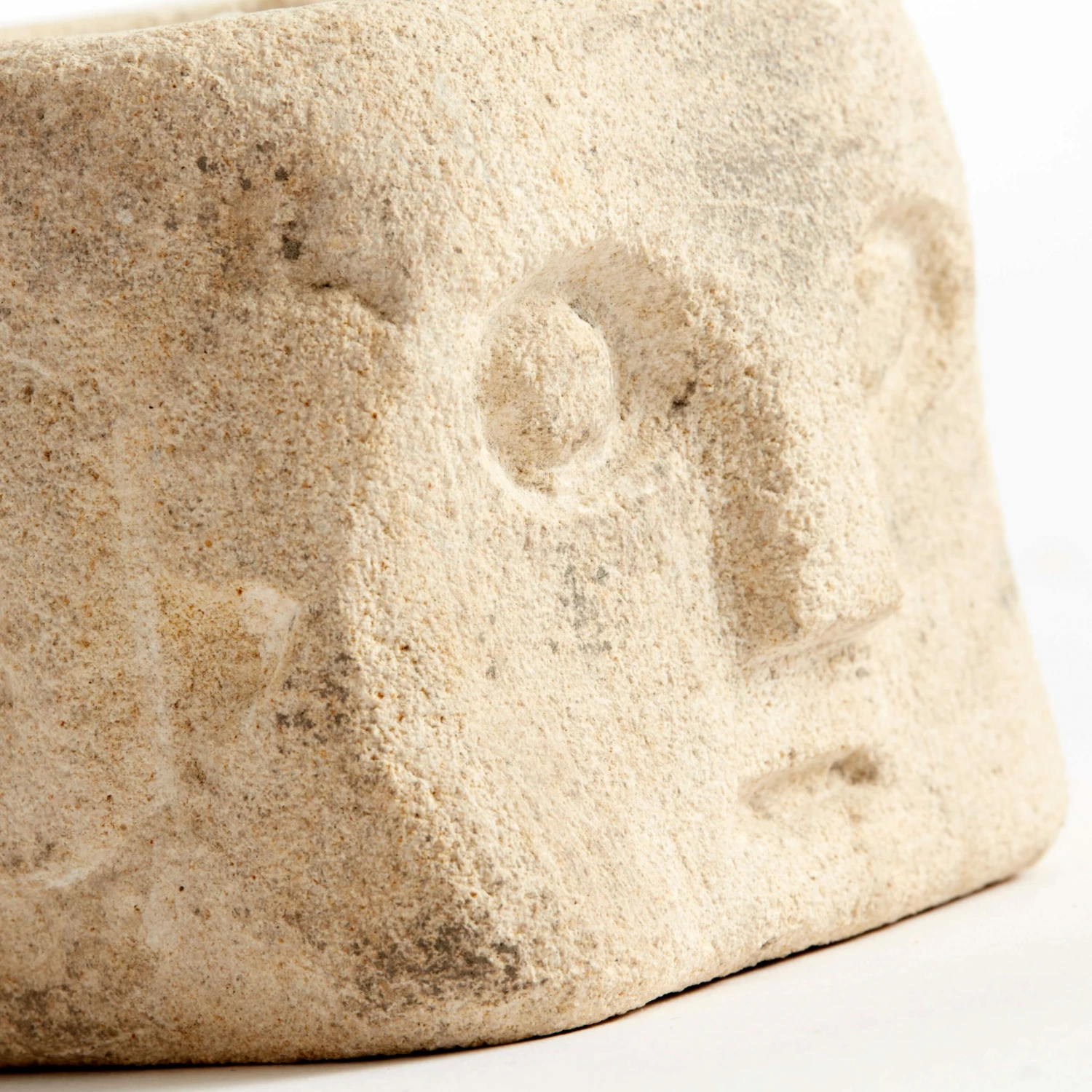 A quirky sculptural candlestick made of sandstone. The face has a unique and interesting expression. As well as a tea light holder it can be used decoratively with other pots and jars or even as a ring or jewellery holder on a dressing table. Material: Sandstone Dimensions H: 5.5cm D: 6.5cm