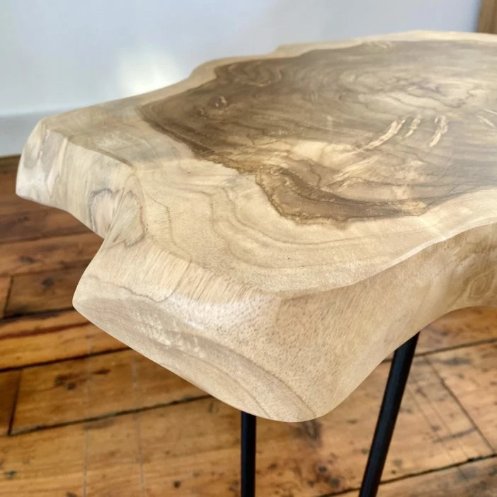 This small side table is made from teak root. The cross section helps preserve the grain and grain of the wood as well as its natural shape. The top is mounted on 3 metal legs. The contrast between the natural teak top and the industrial iron legs highlights the best of both materials.