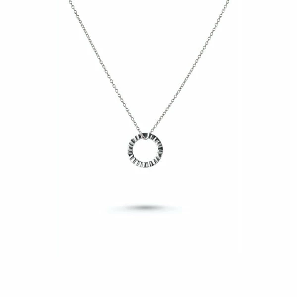 A silver contemporary circle charm on a silver chain, perfect for everyday wearing. This necklace comes beautifully packaged in our signature glass bottle.