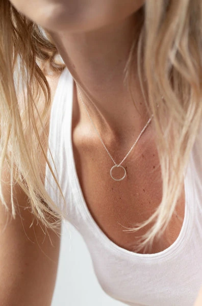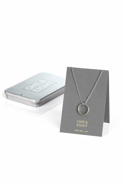This modern Eternity Hoop Necklace is the perfect necklace for everyday wear and comes beautifully packaged in a contemporary sliding tin. This range of jewellery is designed in Devon, UK, working with skilled craftsmen and women across the globe to produce unique gold and silver pieces. Measurements and composition 15mm Fine Silver Hoop Charm Adjustable Sterling Silver Chain which can be worn at 39cm- 43cm / 16-18 inches Gift Packaged in a sliding tin. Packaging Inspirational packaging is part of the One and Eight brand. Your necklace will come beautifully gift packaged in a unique glass bottle with a cork stopper. They continually strive to produce jewellery and gifts that have minimal impact on the environment. All products are packaged in reusable or biodegradable materials. ref: 2224