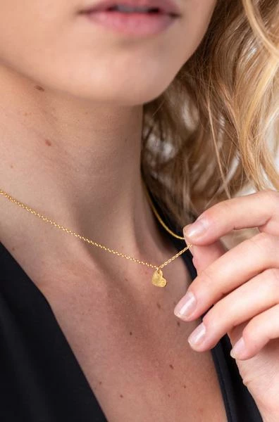 This popular, pretty Gold Heart Necklace has a contemporary brushed finish and come packaged in a reusable glass bottle. The perfect gift for your loved on, or why not treat yourself. This range of jewellery is designed in Devon, working with skilled craftsmen and women across the globe to produce unique gold and silver pieces. Measurements and composition 14mm wide Gold Plated Fine Silver Charm Adjustable 43, 41 or 39cm Gold Plated Sterling Silver chain Gift Packaged in an Elegant Glass Bottle. This necklace has earrings to match. ref: 2099
