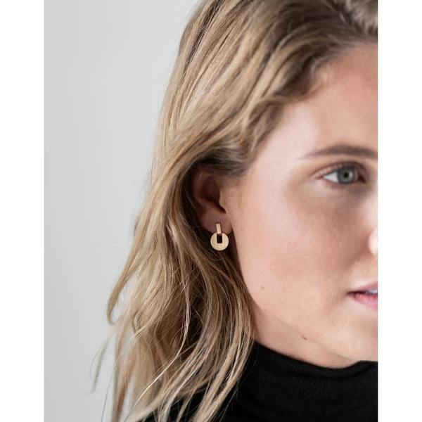 One & Eight Gold Cleo Earrings 14K gold plated sterling silver earrings Unique design For pierced ears Gift packaged in a contemporary glass bottle One & Eight continually strive to produce jewellery and gifts that have a minimal impact on the environment. These earrings will arrive beautifully gift packaged in a unique glass bottle with a cork stopper. An elegant gold design for pierced ears. Earring size 15mm.