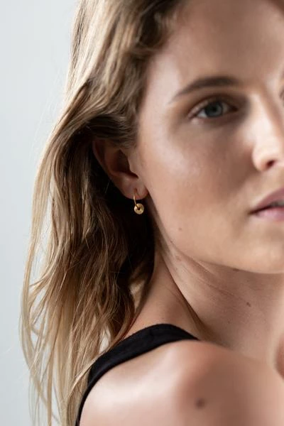 All designed in Devon, working with skilled craftsmen and women across the globe to produce unique gold and silver pieces. These versatile Tolvan earrings are so comfortable you can wear them all day and into the evening. Constructed using a hinged hoop and contemporary charm. Measurements and materials 8mm 24K Gold Plated Fine Silver Charms 14mm 14K Gold Plated Sterling Hinged Hoops Gift Packaged in Unique Glass Bottle These earrings have a necklace to match. ref: 2226