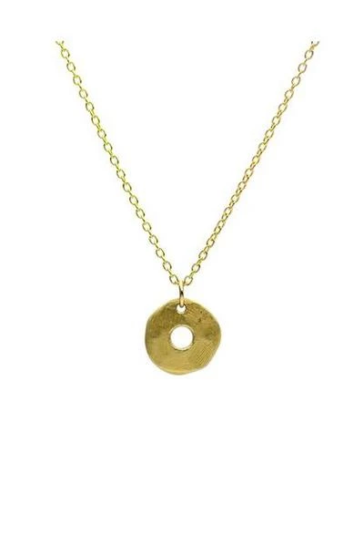 A beautiful freeform gold disc suspended on a gold chain. A gorgeous everyday necklace and a perfect gift. All designed in Devon, working with skilled craftsmen and women across the globe to produce unique gold and silver pieces. Measurements and materials 12mm gold plated silver charm Adjustable 43, 41 or 39cm chain in Gold Vermeil (14k gold plating over sterling silver) Gift Packaged in an Elegant Glass Bottle. This necklace has earrings to match. ref: 1968