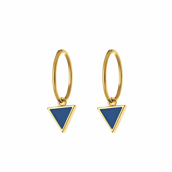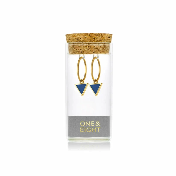 One & Eight Navy Triangle Earrings 14mm 24k gold plated sterling silver hoops 7mm navy enamel gold plated charm Presented in glass bottle with cork