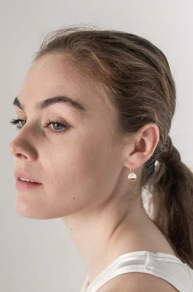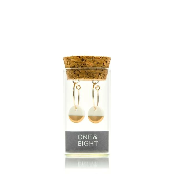 Our bestselling dipped earrings are handmade in One and Eight’s Devon studio and come in a beautiful glass bottle. The porcelain discs are made via an intricate process where clay is coloured, crafted, fired and glazed, before adding the final gold or silver design. Real gold or silver lustre is added to the surface of each charm before the final firing. This seals the lustre into the glaze creating elegant, durable jewellery. Measurements and composition 10mm handmade white porcelain discs with gold dipped design Cork and Bottle 15mm 14k filled gold hoops Due to the nature of the clay, each pair of earrings is unique in form and size. These earrings have a necklace to match. They are also available in silver. Packaging Inspirational packaging is part of the One and Eight brand. Your earrings will come beautifully gift packaged in a unique glass bottle with a cork stopper. One and Eight continually strive to produce jewellery and gifts that have minimal impact on the environment. All their products are packaged in reusable or biodegradable materials.