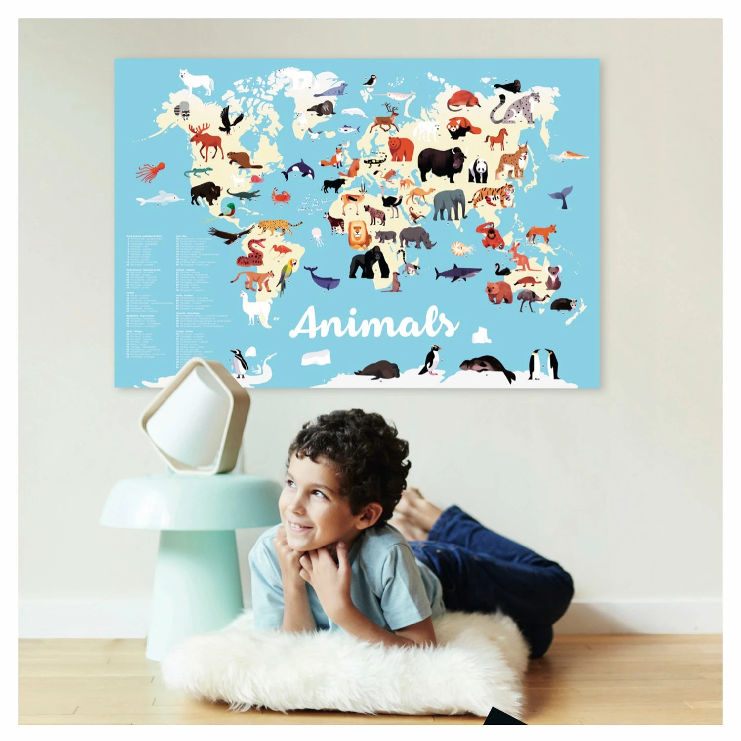 Unfold the large poster and stick the most famous animals of the world: fox, wolf, polar bear, narwhal, panda, koala, kangaroo … A numbered code makes it easy to recognize the good location of each animal. On the the notice in 5 languages (English, French, Spanish, German and Italian), you will find the names of the animals. This poster allows the child to locate the animals on the world map: the panda lives in Asia, the koala in Australia … Before sticking each animal, he has to observe, compare, identify, which allows him to memorize information. This poster is a beautiful decoration for the room. Poster size is a standard frame size for easy framing. Content: 1 poster (1 m x 68 cm) + 67 stickers Recommended Age: 5+ Years Removable stickers