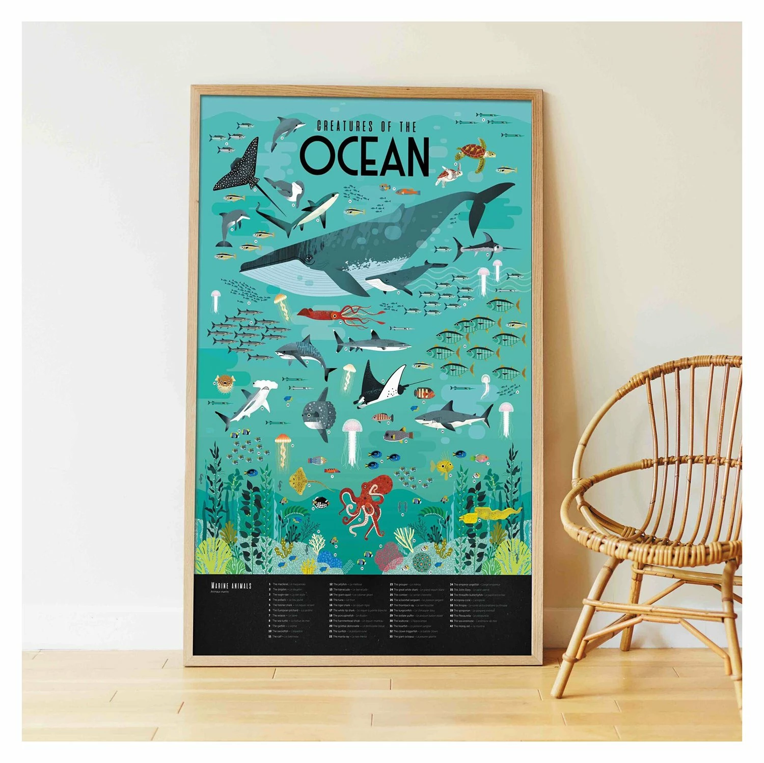 Unfold the large poster and stick marine animals of all kinds: whale, dolphins, sharks, jellyfish and other multicolored corals. A numbered code makes it easy to recognize the correct location of each animal. In a notice in 5 language (English, French, Spanish, German and Italian), you will find the name of each animal. This poster allows the child to discover the animals of the seas and to marvel at their beauty. Before sticking each animal, he has to observe, compare, identify, which helps him to better memorize the information. This poster is a beautiful decoration for the room. Poster size is a standard frame size for easy framing. Content: 1 poster (1 m x 68 cm) + 59 stickers Recommended Age: 6+ Years Removable stickers
