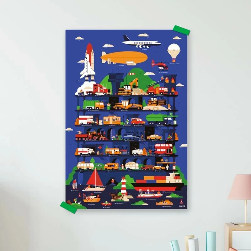 Vehicle poster with repositionable stickers from Poppik! Teach your little ones about all kinds of machines: helicopters, trucks, motorcycles, submarines with this educational poster. Kids place the stickers on the giant poster and will have fun recognizing the vehicles, whether they drive, fly or float. Place the poster flat, on a table or on the floor, and start sticking the stickers by following the numbers. Once the large vehicle poster is finished, it is intended to decorate the house. The activity is easy, allowing kids to play alone without an adult present. Without effort, the child concentrates naturally during long periods of play. This quiet activity trains fine motor skills and observation skills. Content: 1 poster (1 m x 68 cm) + 44 reusable stickers. Poster printed on both sides (1 side in French, 1 side in English) Recommended Age: 3+ Years Removable stickers