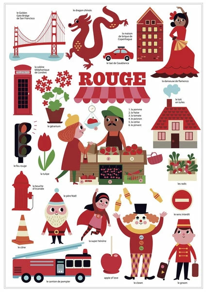 Crea una hermosa mini-lámina de la temática del color rojo con las 21 pegatinas removibles a todo color. Es una excelente manera de aprender y memorizar los nombres de animales, objetos y otros elementos que reconocemos como referencias en color rojo. Está impresa a dos caras en inglés y francés. Podrás encontrar los nombres en otros idiomas en el interior. La lámina está diseñada por la famosa ilustradora sueca Ingela Arrhenius, mundialmente conocida por sus diseños coloridos y divertidos. El espíritu gráfico y los colores de esta lámina la convierten en un hermoso elemento para decorar la casa. Esta actividad ha sido diseñada para niños de 3 a 8 años. Contiene: una Lámina de 21 x 30 cm. Impresa por las dos caras (En Inglés y Francés) y 21 pegatinas.