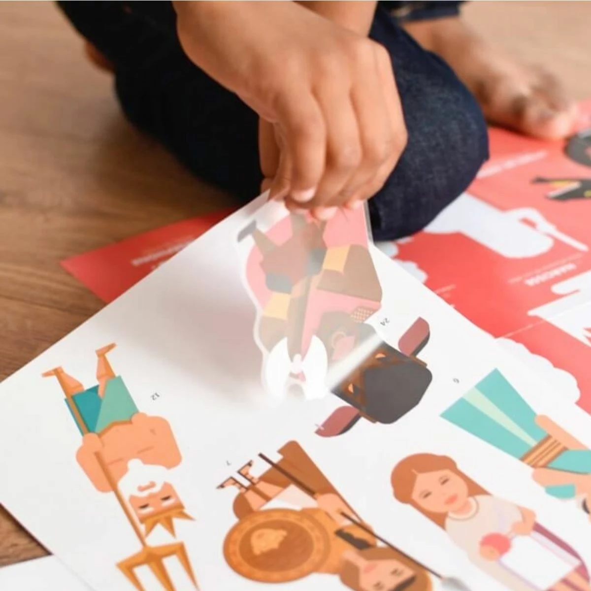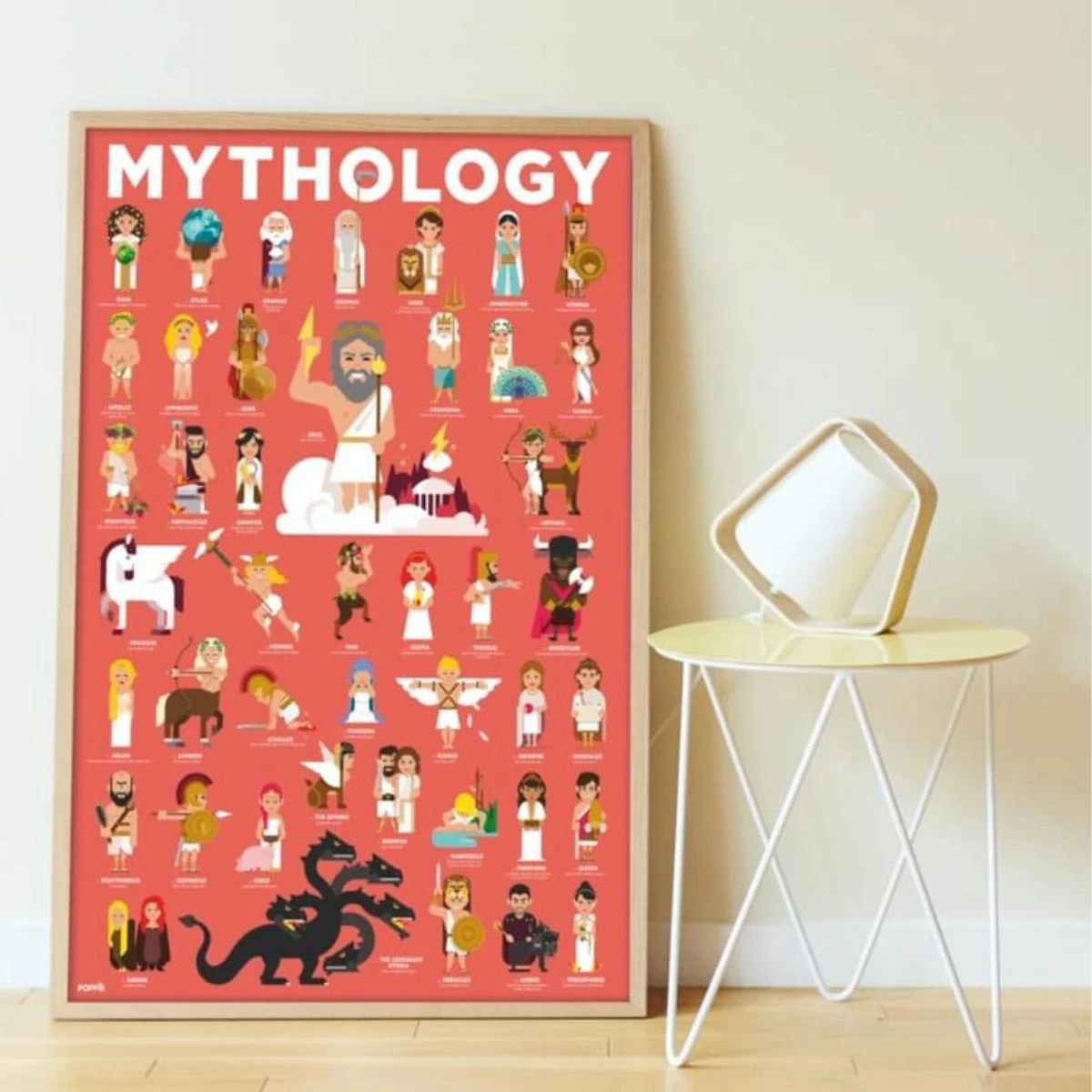 Póster de grandes dimensiones con 38 pegatinas removibles de personajes mitológicos que hay que colocar en los espacios en blanco numerados del póster. Está impreso a dos caras en inglés y francés y para los otros idiomas, se indica el nombre en un folleto adjunto. Todas las figuras mitológicas están representadas con sus atributos y ofrecen una gran oportunidad para ampliar conocimientos y conocer sus aventuras. Posteriormente, es perfecto para decorar la habitación.